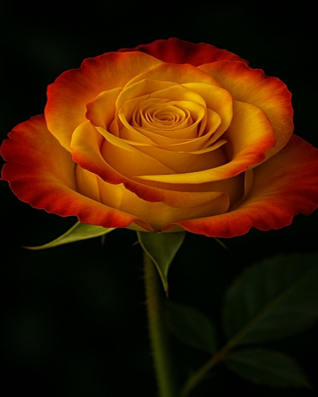 The High and Yellow Magic Rose (Rosa ‘High and Yellow Magic’) is a vibrant bicolor variety, characterized by its bright golden center that expands toward the edges in an intense red gradient. Its velvety petals open in a perfect spiral, highlighting the warm transition between both colors and creating a captivating visual effect.
