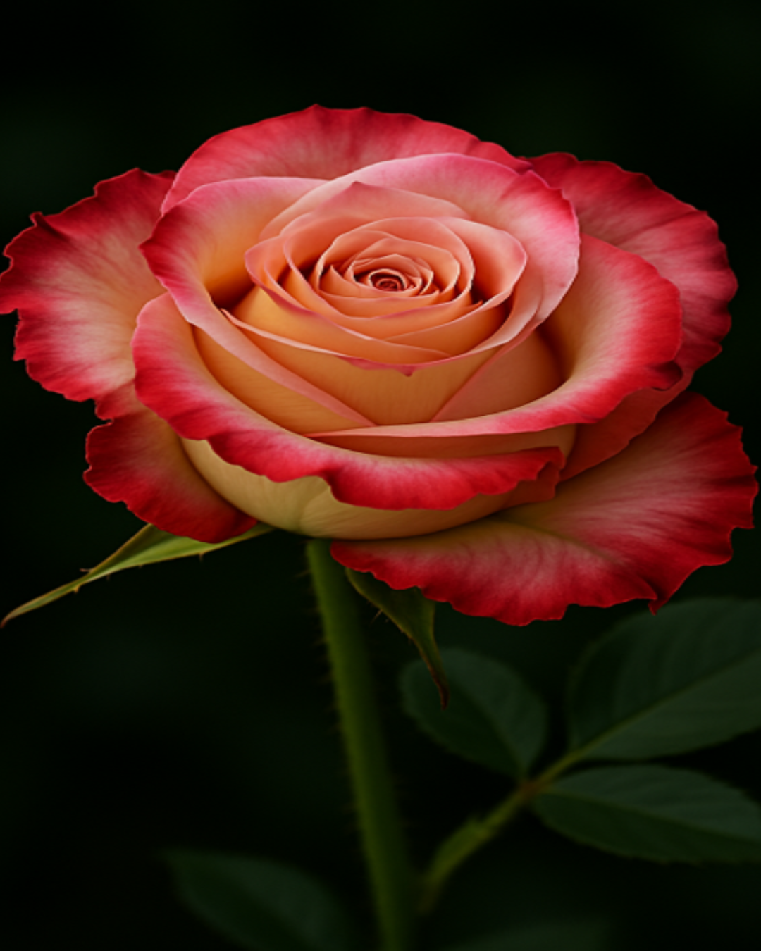 The Sweetness Rose (Rosa ‘Sweetness’) is a highly elegant bicolor variety, characterized by its center in soft cream and peach tones, framed by intense pink edges with red undertones. The color transition on its petals creates a delicate yet vibrant contrast, highlighting its perfectly spiraled and velvety form.