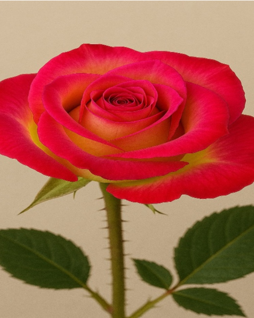 The Malibu Rose (Rosa ‘Malibu’) is a spectacular bicolor variety that harmoniously combines a warm, luminous yellow center with a vibrant, intense fuchsia edge. Its velvety petals open in a spiral, creating a striking and elegant contrast that highlights its unique beauty.