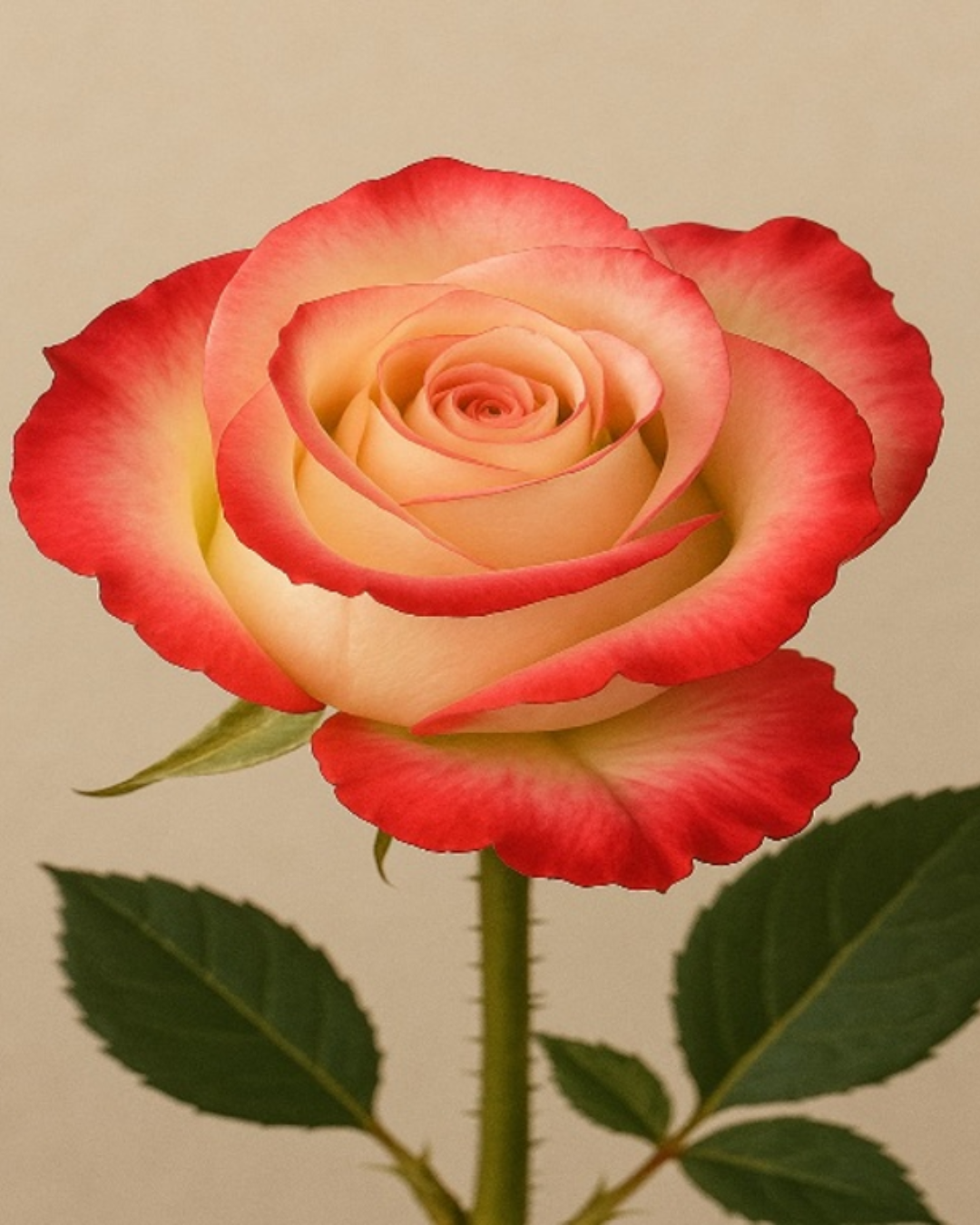 The Blush Rose (Rosa ‘Blush’) is a bicolor variety distinguished by its center in soft cream and peach tones, surrounded by a vibrant coral red edge. Its velvety petals open in a spiral, creating a warm and elegant contrast that makes it unique among bicolor varieties.